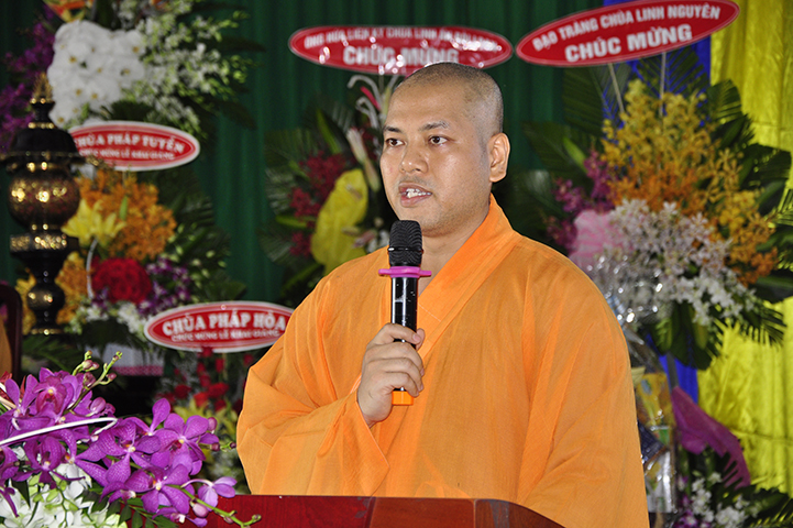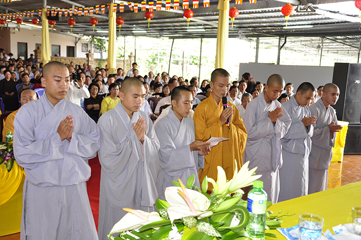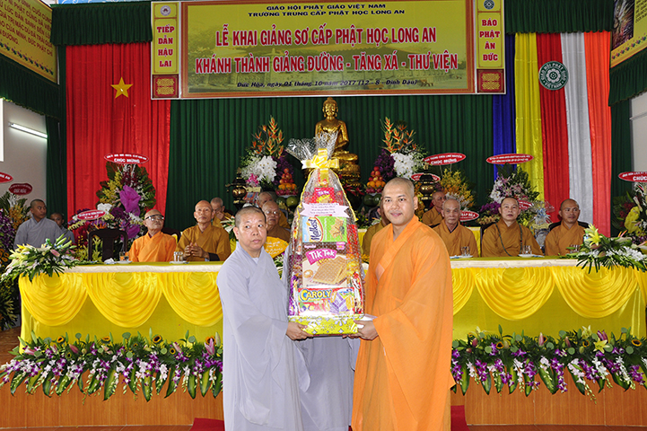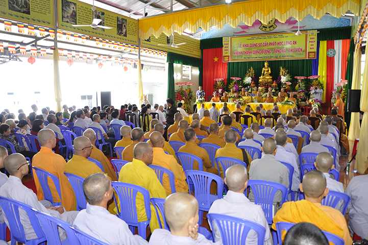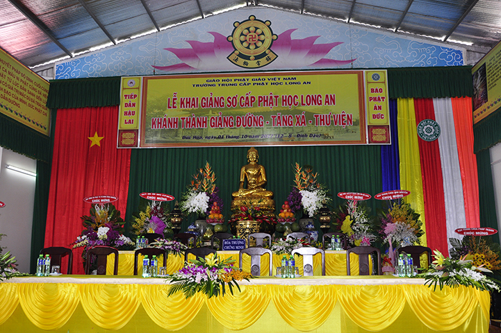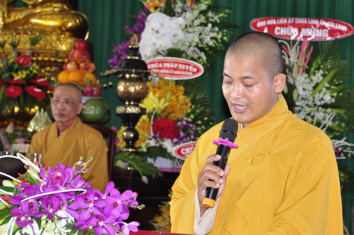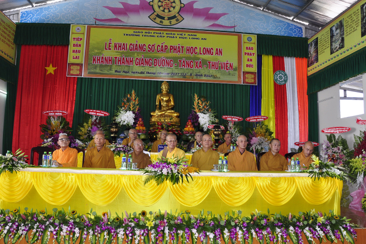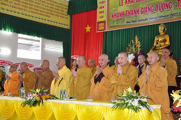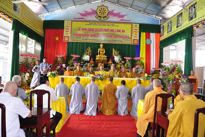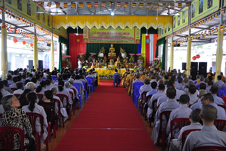 Đại đức Thích Lệ Duyên – Chánh thư ký GHPGVN tỉnh Long An thay lời ban tổ chức tuyên bố lý do.  ĐĐ. Quảng Lâm thay lời Ban Chủ nhiệm và Ban Xây dựng báo cáo quá trình xây dựng giảng đường – tăng xá – thư viện  với tổng diện tích sử dụng trên 1309 m2 và chi phí trên 12 tỷ đồng.