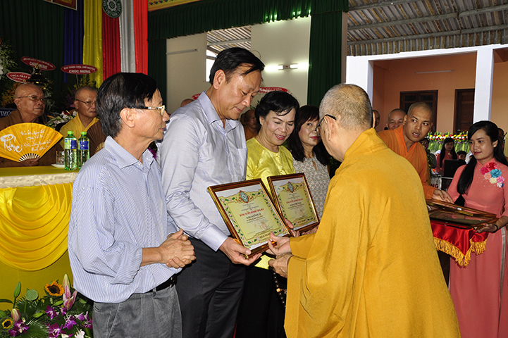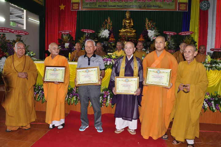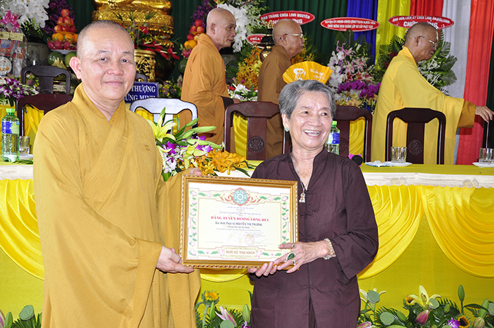 HT Thích Thiện Đức trao tặng bằng tuyên dương công đức đến gia đình  Trương Đức Nhân, Hứa Liên Trì, chùa Linh Nguyên, Đại đức Thích Quảng Lâm.