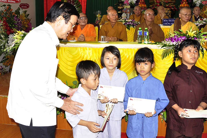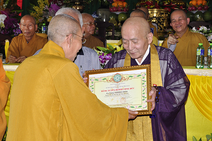 HT Thích Thiện Tánh: Phó Chủ tịch HĐTS, Trưởng ban Kiểm soát GHPGVN trao tặng bằng tuyên dương công đức đến gia đình ngài Trương Tấn Sang; Huỳnh Bá Lân; Trương Minh Tuyết; Đặng Thu Thuỷ; Đặng Thu Hà, HT Yoshimizu Daichi, gia đình Mai Văn Trí, Nguyễn Văn Trường, Nguyễn Thị Phương, Mai Kim Tuyến.