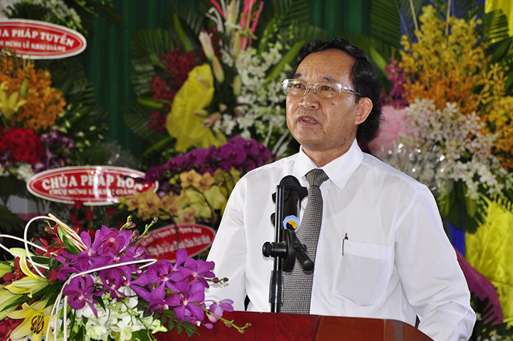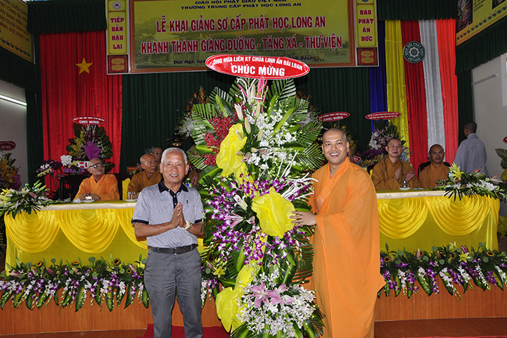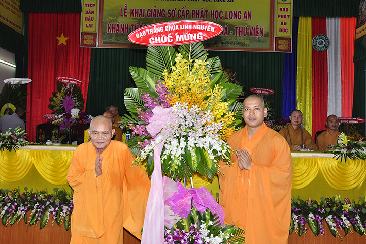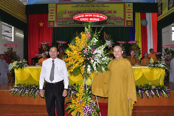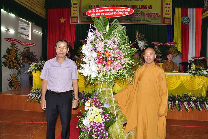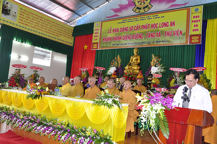 Trong buổi lễ, ông Huỳnh Văn Thuần – Phó giám đốc Phòng Nội vụ, Trưởng ban Tôn giáo tỉnh Long An đại diện chính quyền phát biểu nhân dự lễ khai giảng lớp sơ cấp Phật học tỉnh Long An. Trong phần phát biểu, Ban Tôn giáo rất vui, tự hào và khen ngợi Phật giáo tỉnh Long An đã làm tốt theo hiến chương Giáo hội và luật pháp Nhà nước, đồng thời góp công lớn hiện đại hoá tỉnh qua sự đạt chuẩn Nông thôn mới trên 60 xã.