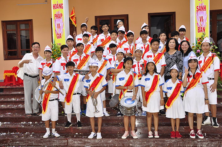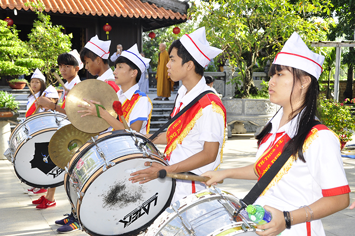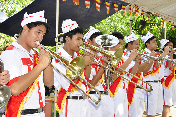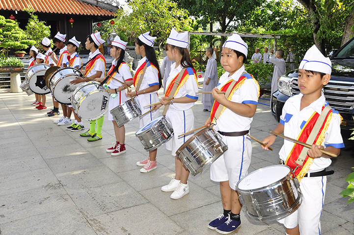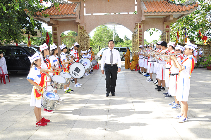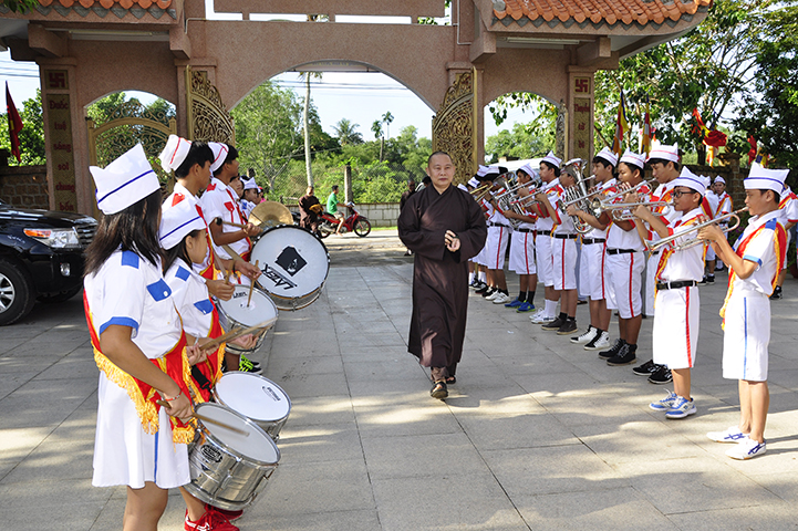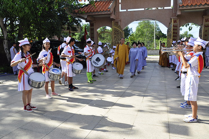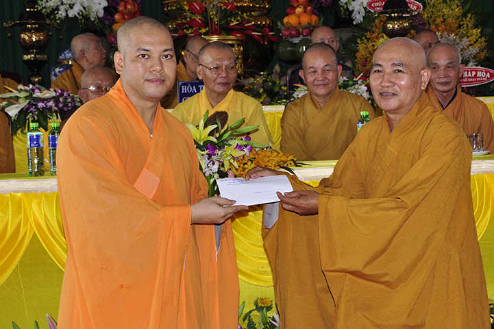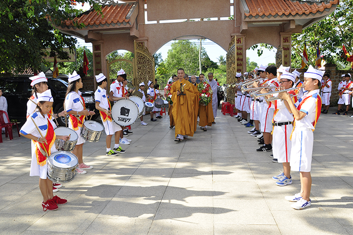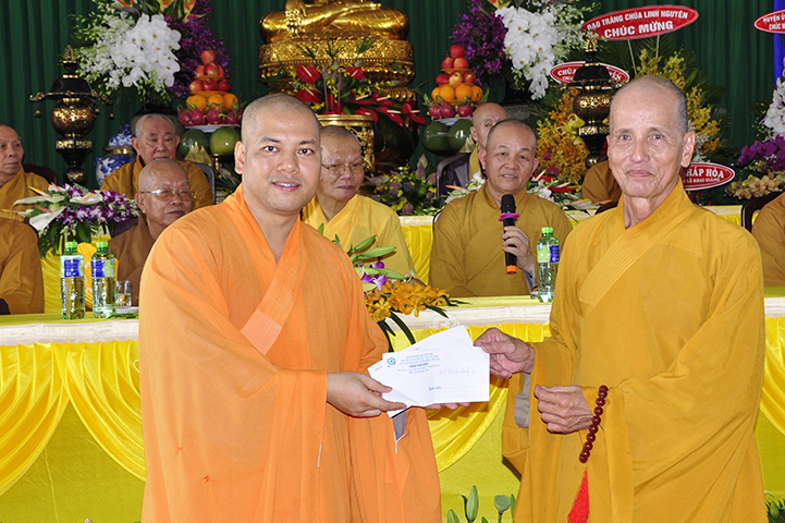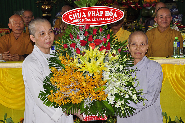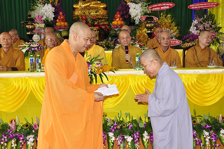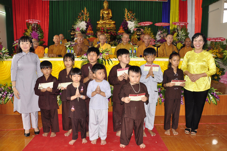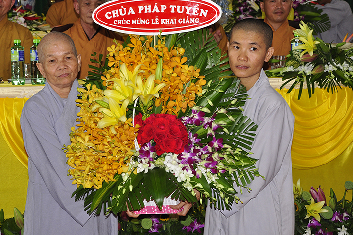 Tiếp theo, ban tổ chức đón nhận rất nhiều lẵng hoa chúc mừng và trao 30 học bổng cho các em học sinh giỏi địa phương với ba tiêu chí: hiếu hạnh; học giỏi, tôn kính Tam Bảo.