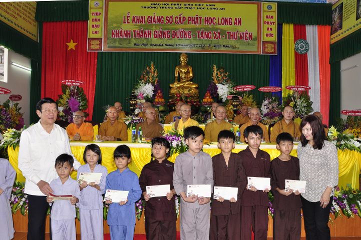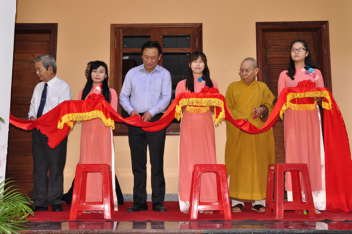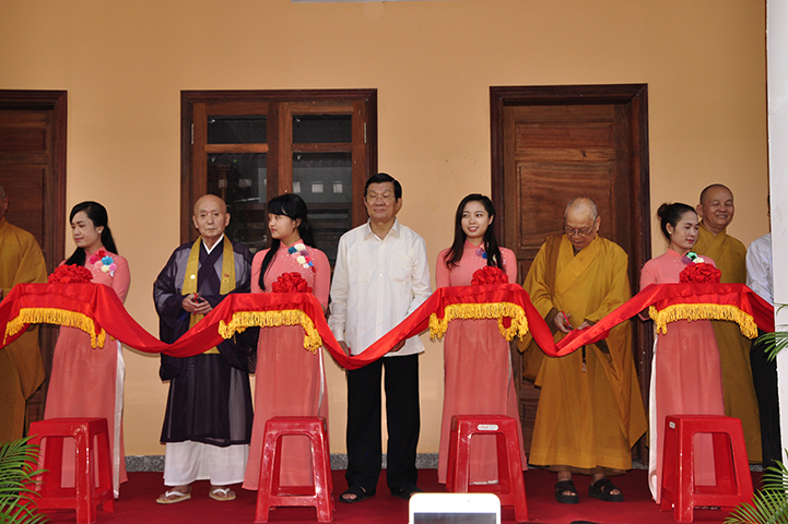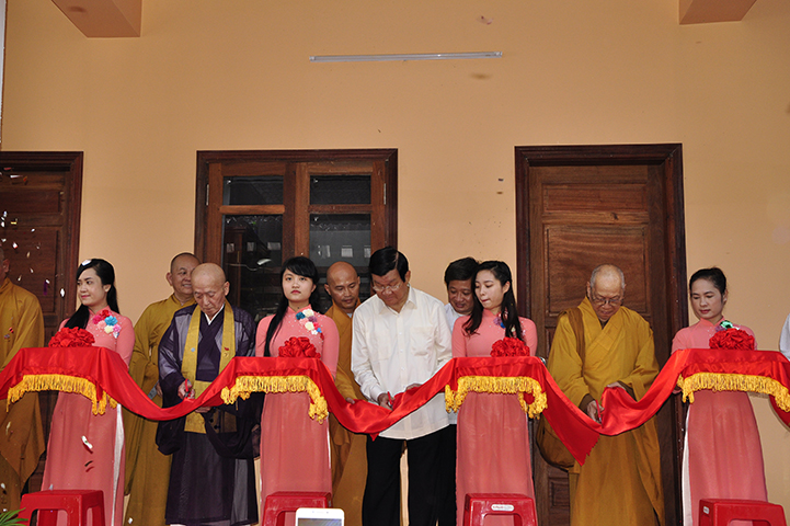 Sau cảm tạ của Ban Tổ chức, Chư Tôn giáo Phẩm, quý Quan khách thực hiện nghi thức cắt băng khánh thành giảng đường – Tăng xá – thư viện và thăm quan cơ sở đào tạo Sơ cấp Phật học Long An