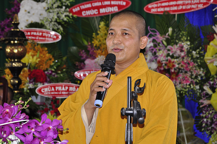HT Thích Minh Thiện – UV HĐTS TW, Trưởng Ban Trị sự GHPGVN- Hiệu trưởng Trường Trung cấp Phật học Long An đã đại lao chư tôn giáo phẩm chứng minh, tri ân chư tôn đức và các mạnh thường quân. Hòa thượng cho biết định hướng phát triển chùa Pháp Minh, trong tương lai nơi đây sẽ là một trong những trung tâm của Phật giáo tỉnh nhà, dự kiến mở đại giới đàn vào năm 2020. Hòa thượng nêu lên những thành tựu của Tăng Ni sinh xuất thân từ trường đạo tạo của Phật giáo Long An để khích lệ các tân Tăng Ni sinh lớp sơ cấp. Đồng thời Ngài cũng trình bày tâm nguyện mở lớp Cao đẳng chuyên khoa, đào tạo hoằng pháp viên Phật tử để phát huy tinh thần lợi ích chung của Phật giáo Việt Nam. Ngài khuyến khích Tăng Ni sinh Sơ cấp hãy nỗ lực tu học. Sau khi tốt nghiệp, nếu Tăng Ni sinh nào thông thạo Hoa văn, Ban Chủ nhiệm sẽ tạo tài trợ học bổng toàn phần du học Đài Loan.